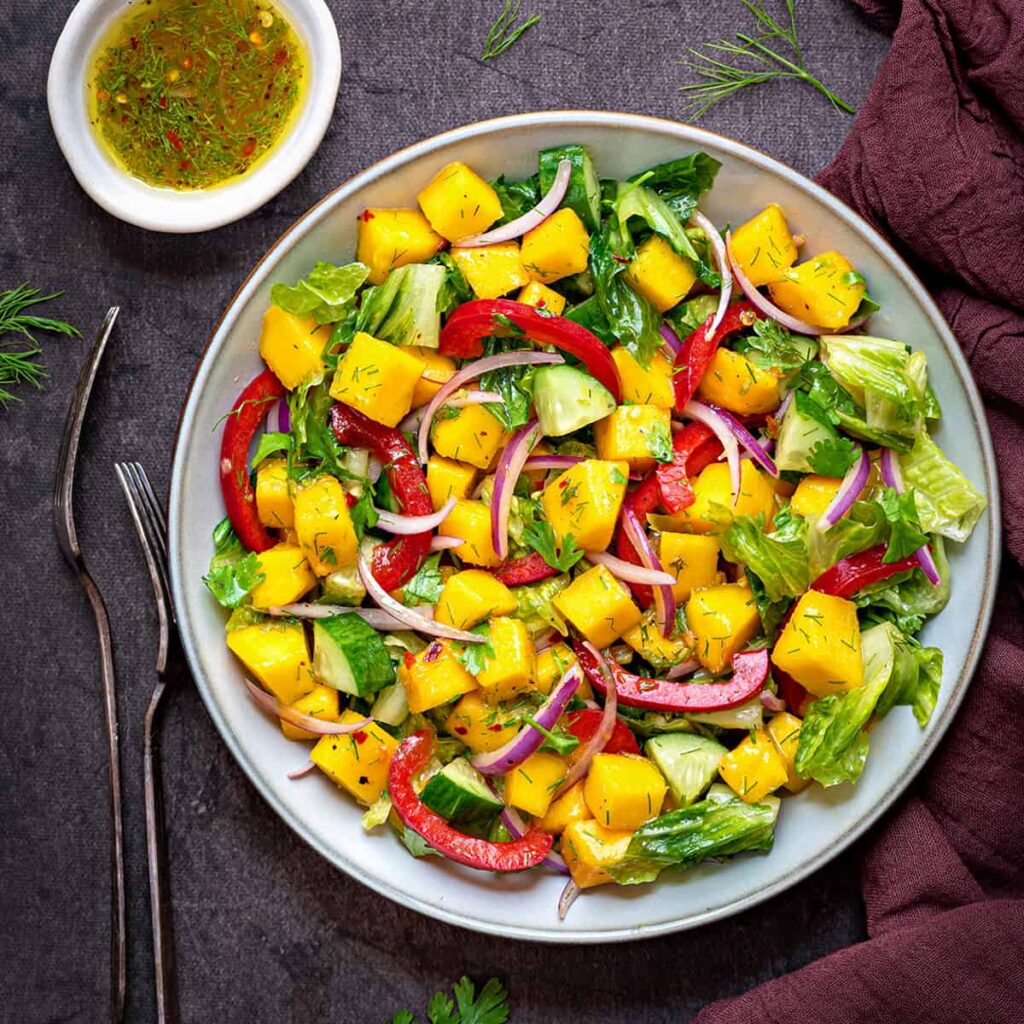 2. In a large bowl, combine the mixed greens, diced mango, cucumber, cherry tomatoes, and avocado.